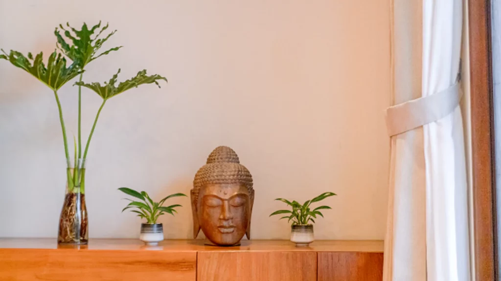 A green oasis in modern minimalist design, offering a unique blend of elegance and serenity —enhanced by the harmonious combination of teak wood, stone ornaments, and exotic indoor plants —all set within a modern minimalist aesthetic where Japanese – Scandinavian design philosophies meet in harmony.