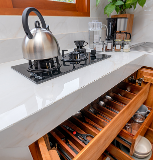 A private kitchenette is thoughtfully provided in every suite, giving guests a cozy space to prepare their own dishes.