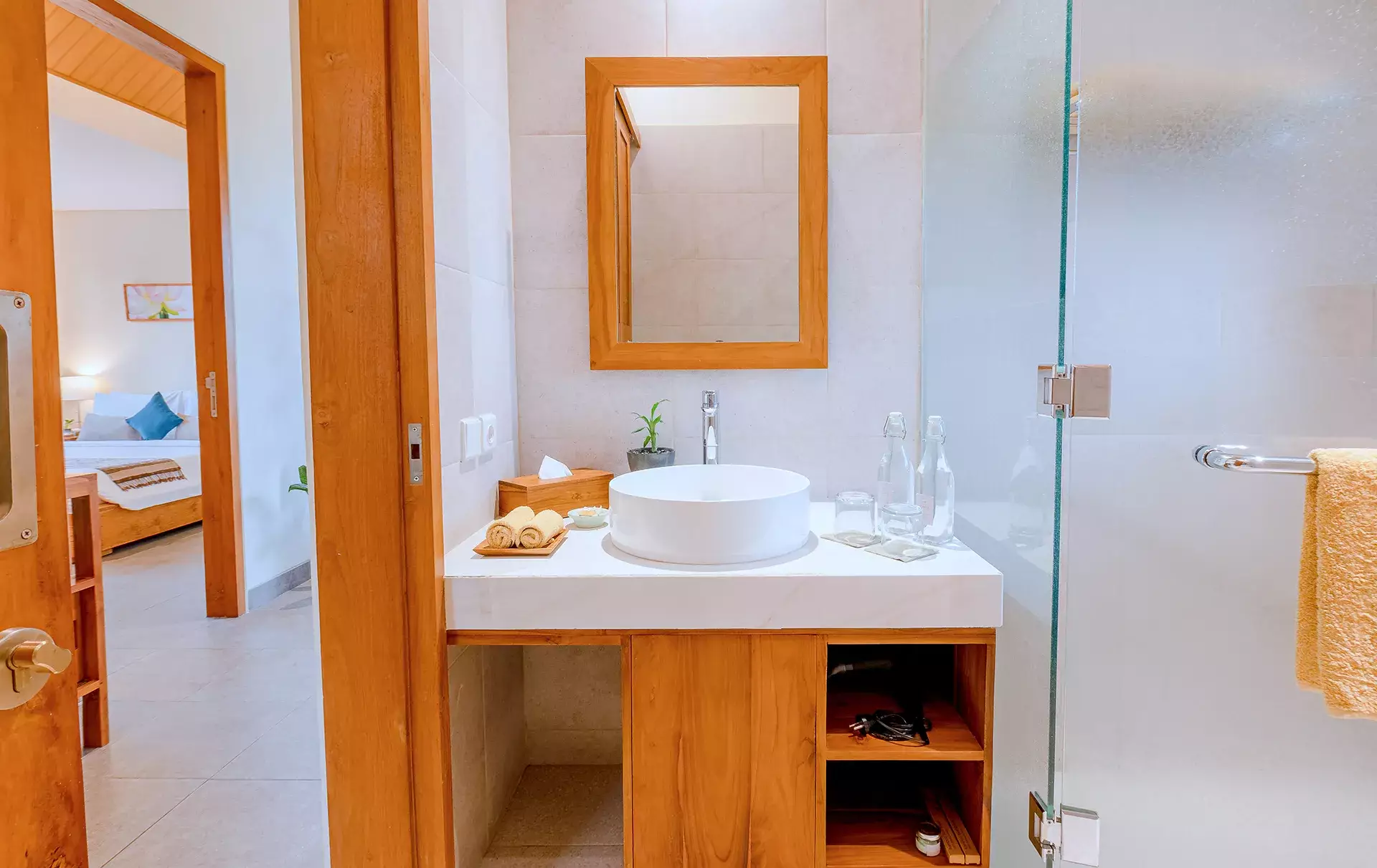 Beyond the simplicity of minimalist design, the tranquil elegance of teak wood, intricate wooden accents, and vibrant indoor plants bring the soothing essence of nature into your daily life, seamlessly blending aesthetic appeal with the practical advantages of minimalist living. Drawing inspiration from Japandi design—a harmonious fusion of Japanese simplicity and Scandinavian warmth—each space is thoughtfully crafted to maximize functionality while maintaining a sense of serenity and connection to nature. Additionally, the design features closed doors and windows, tailored to minimize insect intrusion—an essential consideration for living in Bali's tropical beauty.
