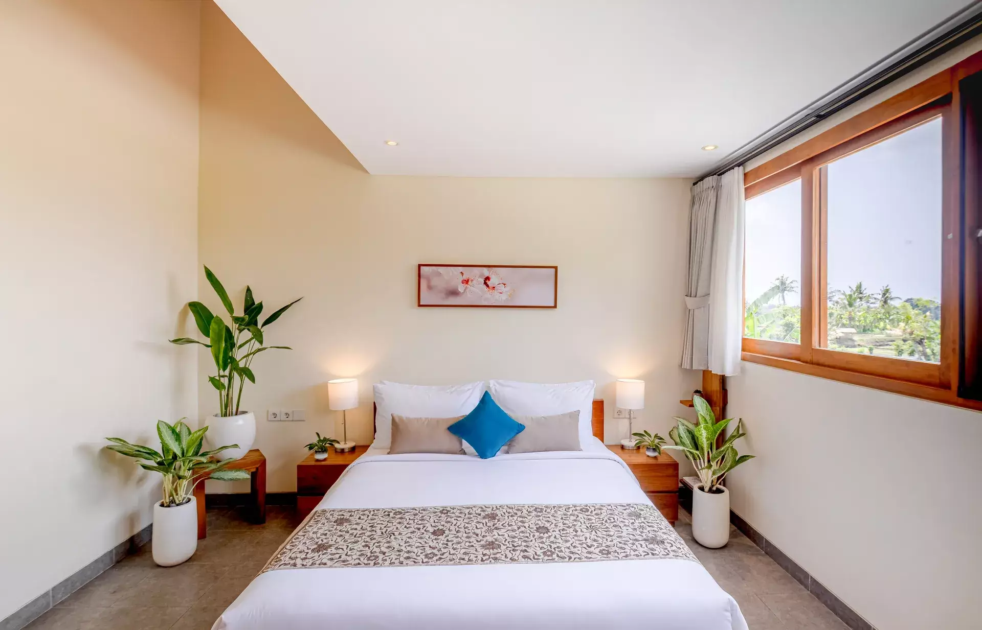 An eco‑exquisite green sanctuary overlooking rice fields and natural surroundings, the Sakura Room blends the minimalism of Japanese design with the functionality and coziness of Scandinavian style.
